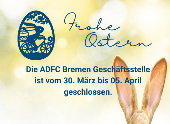 Vom 30. März bis zum 05. April ist die ADFC Geschäftstelle in der Grünenstraße 35 geschlossen. Wir wünschen schöne Osterfeiertage!